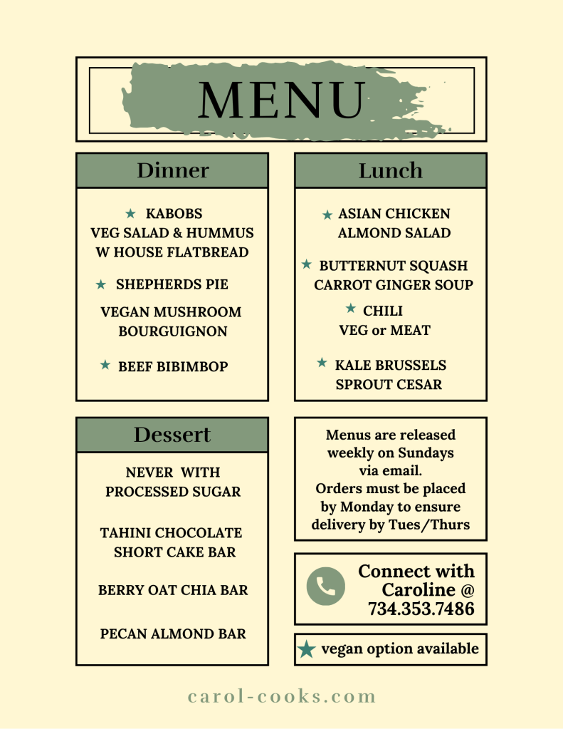 For weekly meal prep I try to keep things simple and of course, tasty. This menu will change weekly and is dependent on what is seasonally prime. If there is something that you need customized reach out to me and I will likely be able to accommodate. This menu is featured in my weekly newsletter so be sure to subscribe. Menus will come out on Sunday, orders need to be placed by Monday evening to ensure I can make timely deliveries for Tuesday and Thursday.
